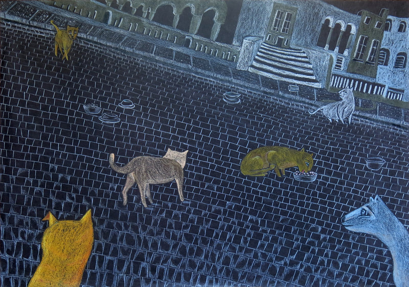 Cats in various surroundings and various illustration techniques.